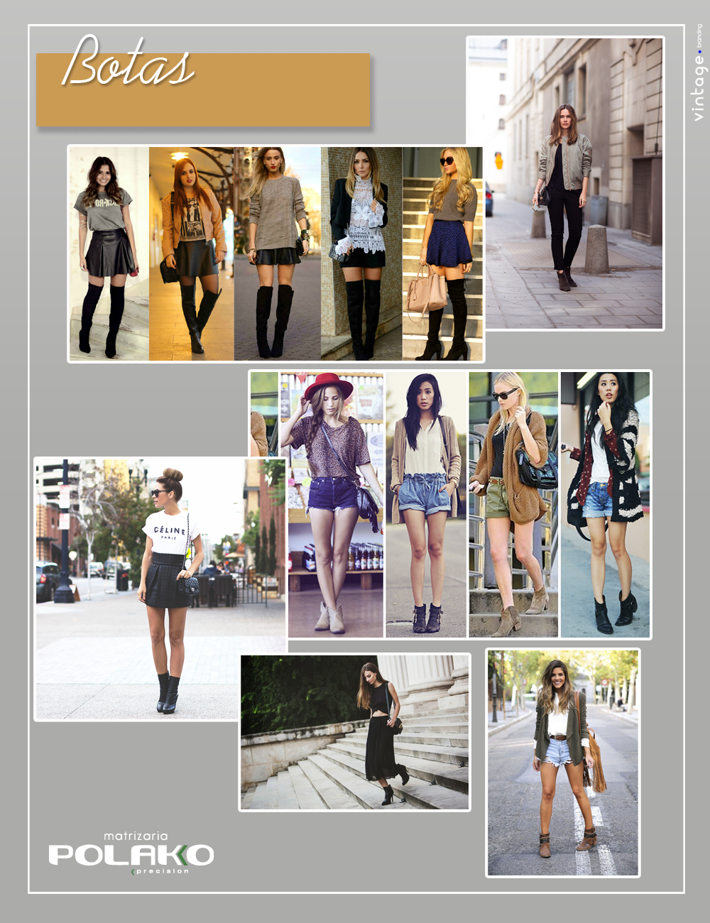 Bota+saia/vestido: Eis aqui uma combinação super feminina e bem versátil para os dias que não se tem inspiração para montar o look. Um vestido, meia calça, bota, casaco e voilà: temos uma combinação arrumadinha e linda para sair. As saias e vestidos carregam uma dica bem simples de moda, quanto mais curta a barra, maior o cano da bota. Não é uma regra, afinal, saias longas combinam super bem com botas longas e criam um visual camponês incrível. Vale a regra para os vestidos mais colados e curtos, que caem super bem com botas Over The Knee e sensualizam com uma pontinha de pele á mostra. Esta combinação é versátil por atender a muitos estilos, visto que a roupa e a bota podem induzir ao look rocker, folk, sexy, tudo depende da escolha dos tecidos e modelos.