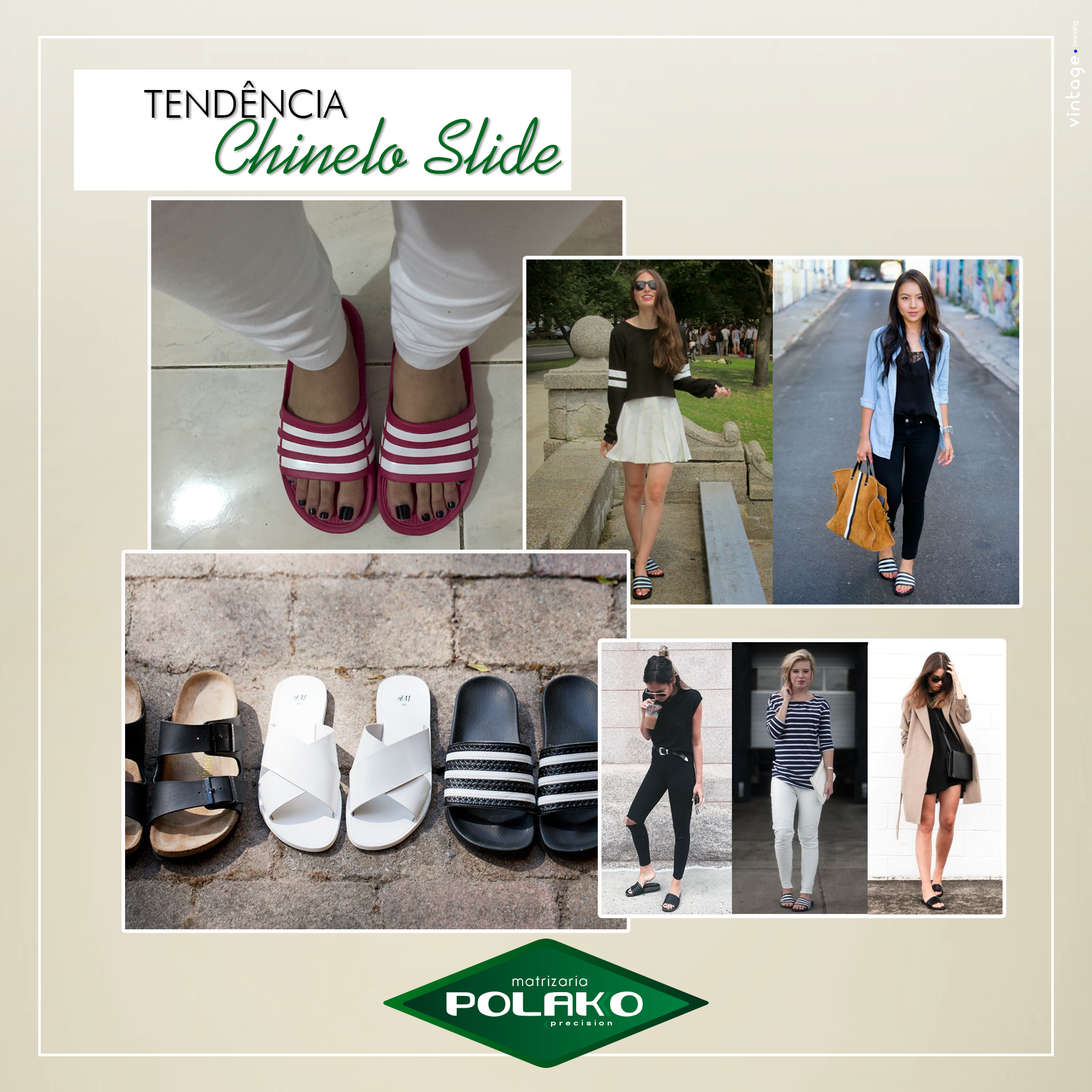 Marcas como a Adidas e a Rider foram pioneiras lançando este modelo, sendo o listrado preto & branco a referência no estilo. Além de confortável, o calçado é uma peça chave para composições mais despojadas em seu dia a dia. Para quem é adepto da moda “normcore”, que traduz a simplicidade de se vestir, o Slide trouxe mais presença ao estilo, sendo combinado com vestidos e calças leves que exalam conforto.