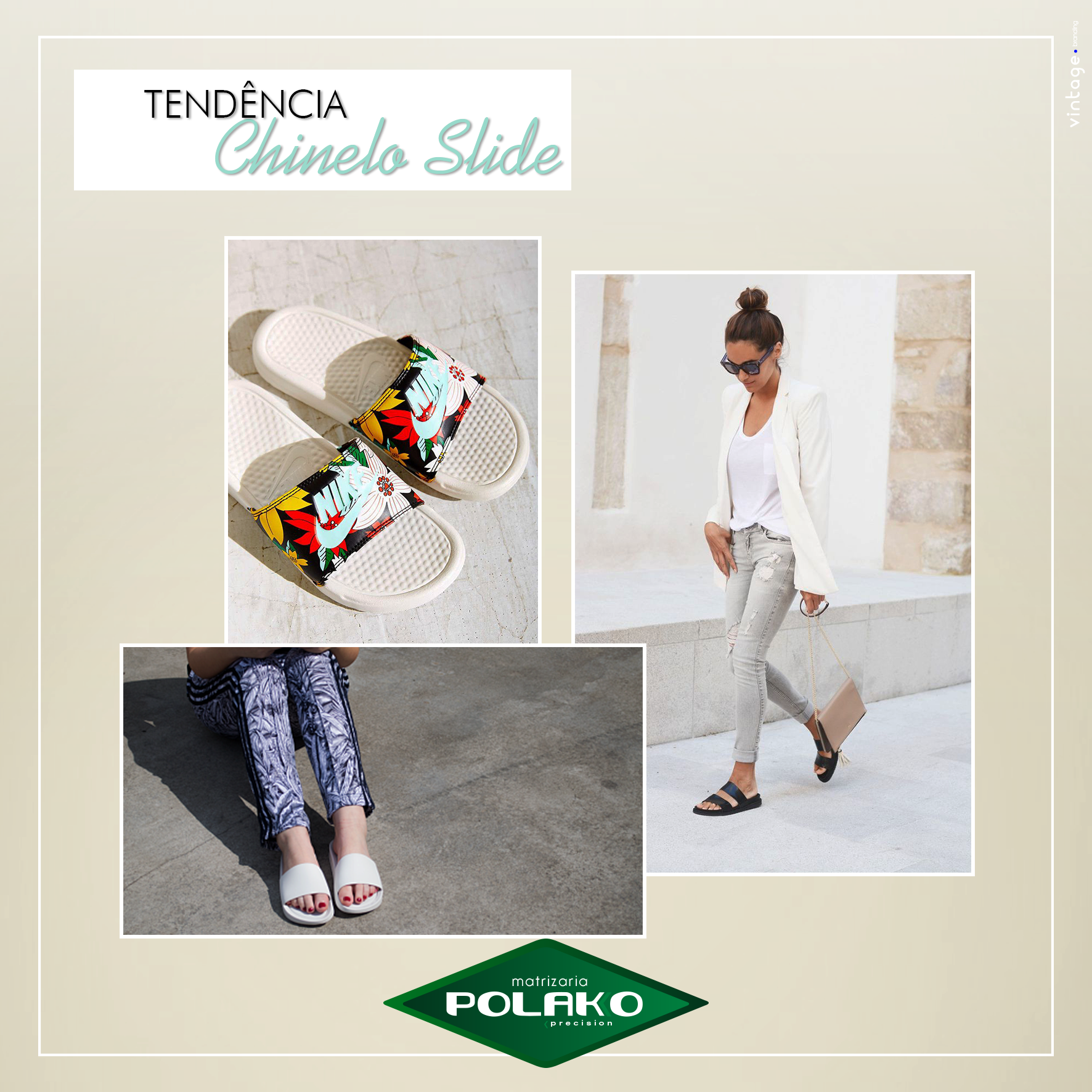 Marcas como a Adidas e a Rider foram pioneiras lançando este modelo, sendo o listrado preto & branco a referência no estilo. Além de confortável, o calçado é uma peça chave para composições mais despojadas em seu dia a dia. Para quem é adepto da moda “normcore”, que traduz a simplicidade de se vestir, o Slide trouxe mais presença ao estilo, sendo combinado com vestidos e calças leves que exalam conforto.
