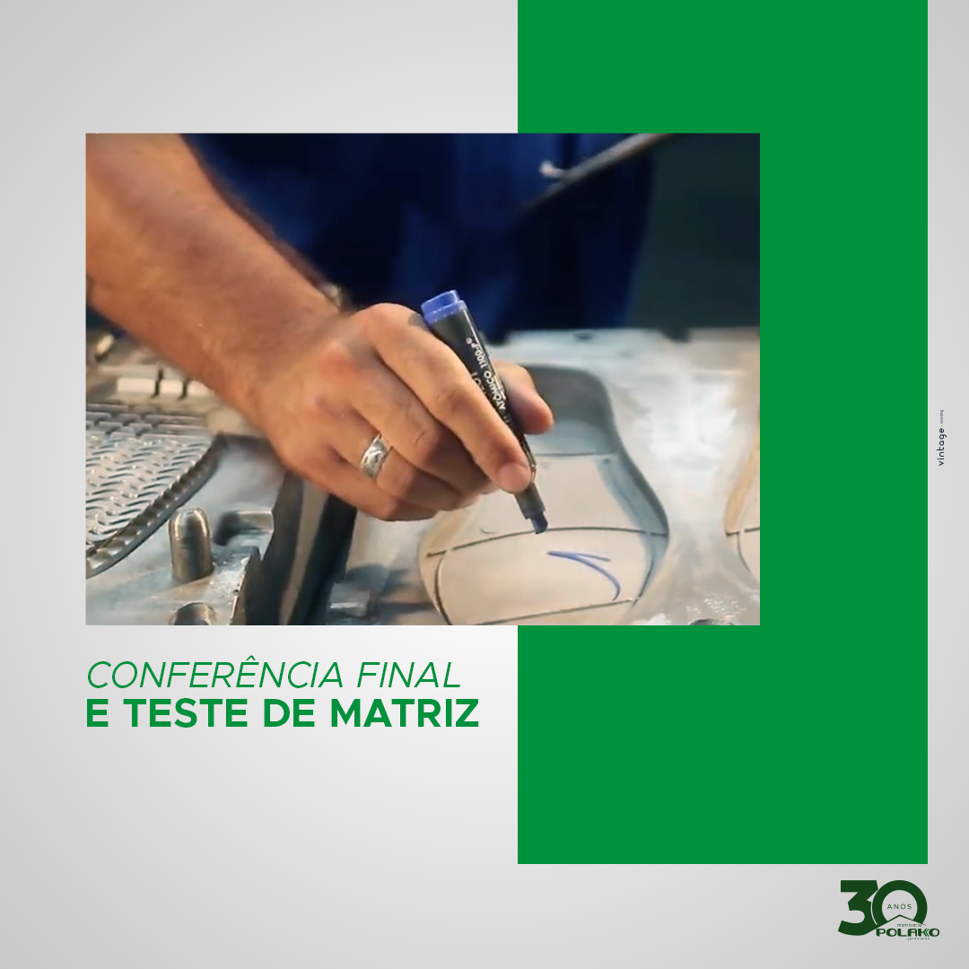 Já a conferência é feita quando molde chega no nosso cliente. O objetivo é garantir que ele funcione corretamente e da melhor forma nas máquinas. A conferência e o teste final são feitos com base no plano de máquina do cliente e conforme o calçado original enviado pelo cliente.