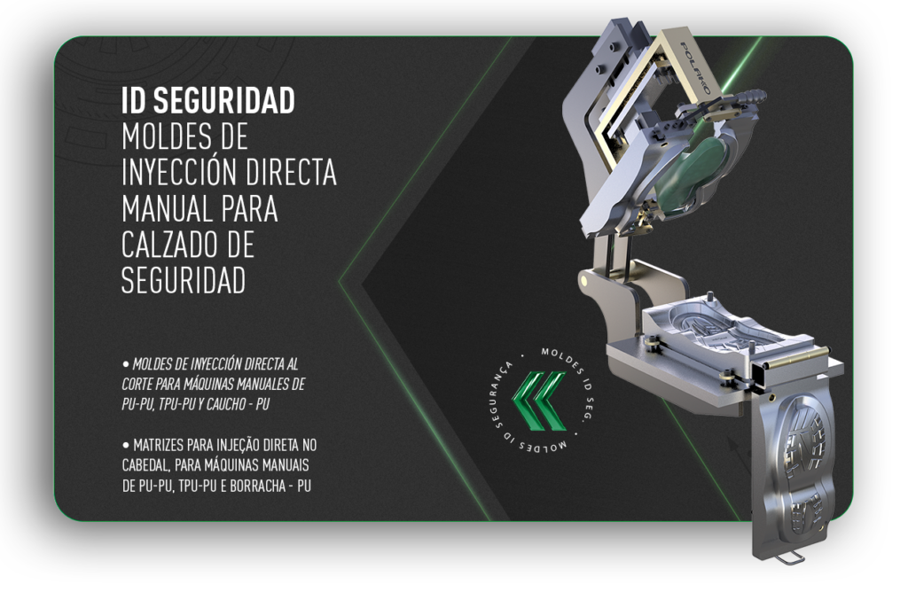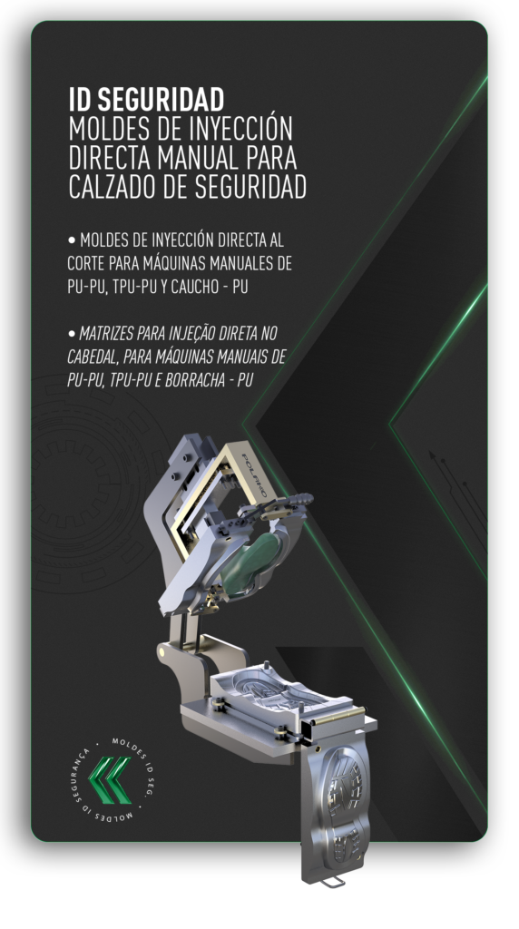 El objetivo principal del molde para inyección directa al corte es reducir etapas en el proceso de fabricación del calzado de seguridad. Inyectadas en poliuretano, monodensidad y doble densidad, los moldes se fabrican según las necesidades de nuestros clientes, siempre dentro de los estándares técnicos exigidos por el mercado de EPI, apuntando a la ergonomía y diseño, favoreciendo así una mayor aceptación y productividad por parte de los usuarios.
