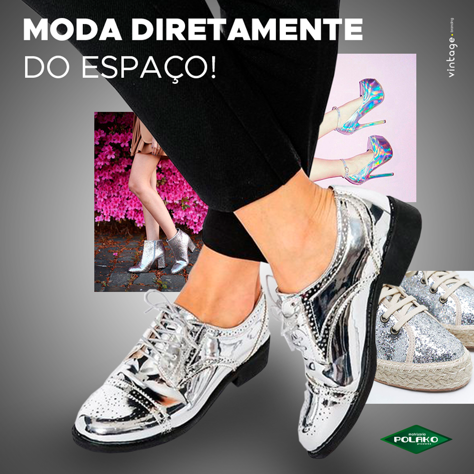 Ou seja, além dos nossos já amados tênis e mocassins prateados, veremos nas ruas muitas botinhas, principalmente sem salto, prateadas e cobertas com glitter prata. Peças mais retas e pesadas, aplicações metálicas e tons sóbrios.